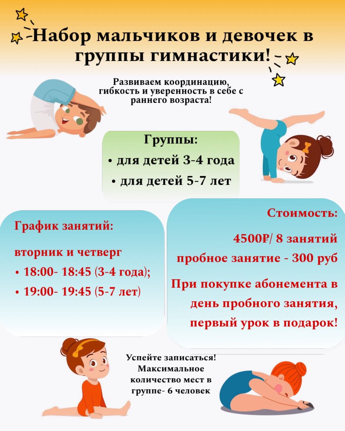 Меня зовут Евгения, и я с радостью приглашаю ваших детей на занятия по гимнастике!